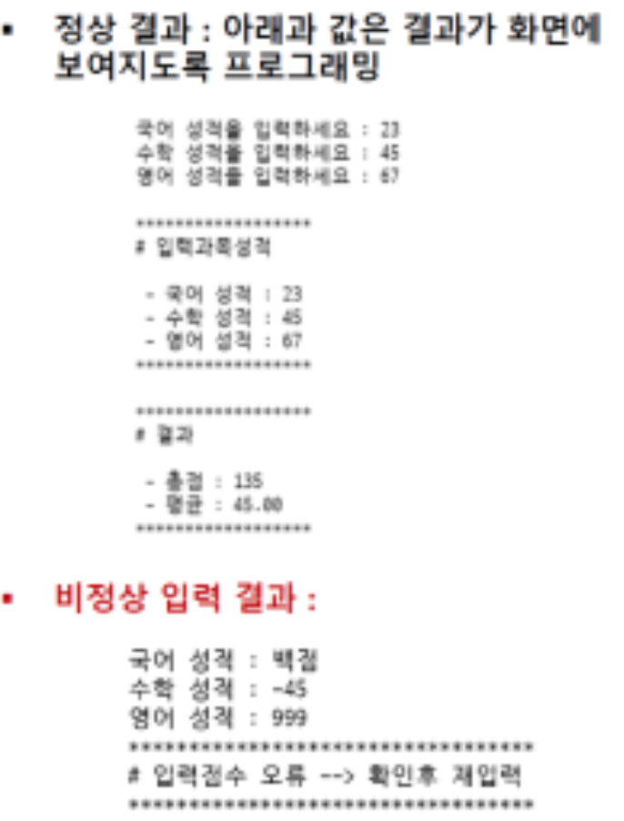 - 입력이 숫자가 아니거나, 입력 숫자가 0<성적 <= 100 아니면 재입력 요구 메시지를 출력한다